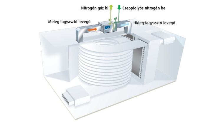A rendszer elszívja a fagyasztótér levegőjét, átvezeti egy cseppfolyós nitrogénnel hűtött (LIN) zárt hőcserélőn, majd ugyanabba a térbe juttatja vissza a fagyasztóban meglévő hideg-meleg légáramlásokkal összhangban. A LIN rendkívül alacsony, -196 °C-os forráspontja miatt a kompakt kriogénes hőcserélők alacsony technológiai lábnyom mellett képesek nagy hűtési tartalékot biztosítani. A felmelegedett nitrogéngáz szabályozottan távozik a szabadba a tetőn keresztül, így a terméktér levegőösszetétele változatlan marad.
