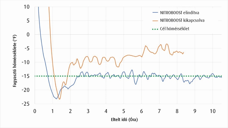 A kompakt LIN-tekercsek könnyen elférnek a meglévő berendezés oldalán vagy tetején, a beépítés pedig jellemzően rövid leállással megoldható. A rendszer működése a pillanatnyi terheléshez igazodó, igényalapú (on-demand): a szenzorok folyamatosan figyelik a levegőhőmérsékletet, és csak akkor nyitják a kriogén kört, amikor a célérték fölé megy a levegő hőmérséklete. A kriogénes rásegítés pedig megszűnik, amint a hőmérséklet visszatér a beállított értékre. A hőcserélő leolvasztása automatikusan időzíthető, és a mechanikus párologtatók ciklusától eltérő időpontban is ütemezhető, hogy a rendelkezésre álló hűtési kapacitás minél egyenletesebb maradjon. A NITROBOOST® így olyan kiegészítőhűtést valósít meg, amely láthatatlanul illeszkedik a napi üzemhez: a felfutás rövidebb, a fagyasztási hőmérséklet görbéje simább, ahol a NITROBOOST® önállóan, de mégis összhangban működik a mechanikus fagyasztóval.