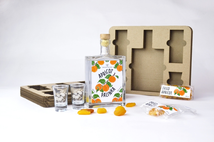 A HUNGAROPACK-on díjazott csomagolás egy barackpálinkát, két pálinkáspoharat és aszalt sárgabarackot tartalmaz