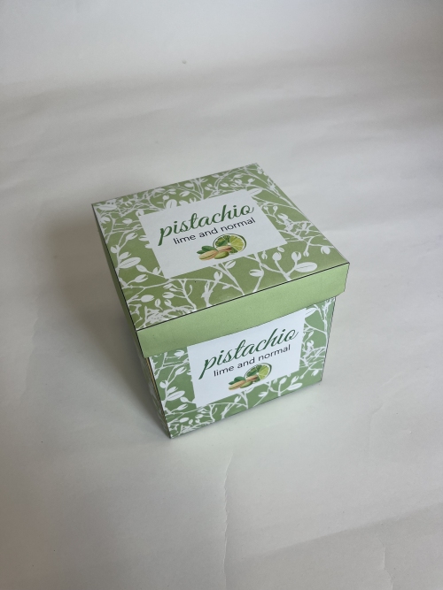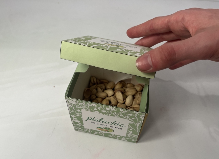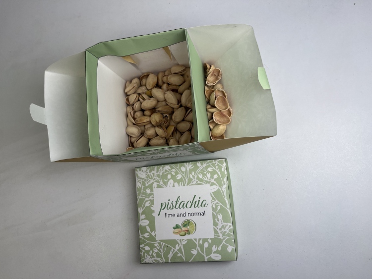 A doboz kialakítását úgy terveztem meg, hogy lehetővé tegye az egyszerű tárolást és hozzáférést a benne lévő pisztáciához. Az oldalsó íves lehajtható részek pedig dinamikus és exkluzív megjelenést biztosítanak. Kis füleket is terveztem a dobozhoz, amelyek hozzájárulnak a könnyű nyitáshoz. A dobozhoz különálló fedél tartozik, ami pontosan illeszkedik a dobozra. A megoldásom nagyon praktikus, hiszen a pisztácia héja elkülönítve tárolható. Ez kényelmesebbé és esztétikusabbá teszi a fogyasztást. A csomagolás alapanyaga papír, és arra is törekedtem, hogy minél csekélyebb legyen az összeállításhoz szükséges ragasztóigénye.